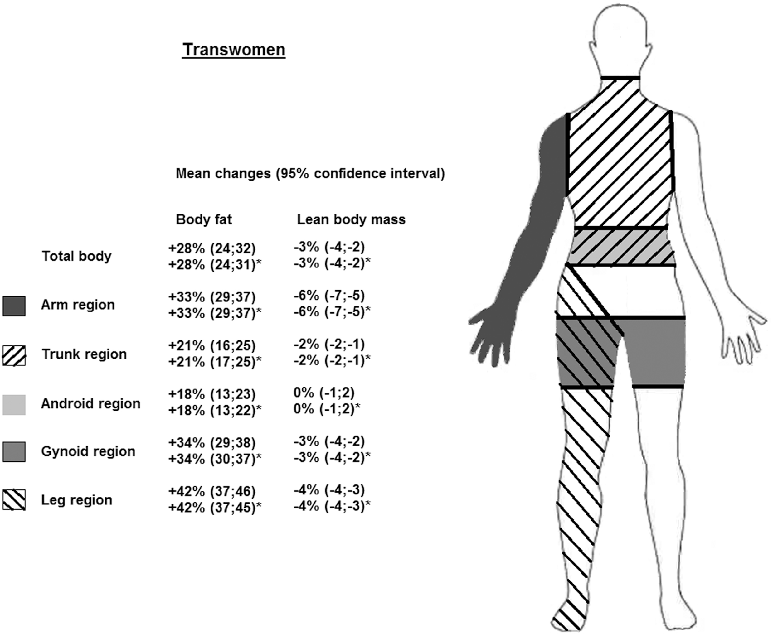 - Klaver, M., de Blok, C. J., Wiepjes, C. M., Nota, N. M., Dekker, M. J., de Mutsert, R., Schreiner, T., Fisher, A. D., T’Sjoen, G., & den Heijer, M. (2018). Changes in regional body fat, lean body mass and body shape in trans persons using cross-sex hormonal therapy: results from a multicenter prospective study. European Journal of Endocrinology, 178(2), 163–171. [DOI:10.1530/eje-17-0496]
