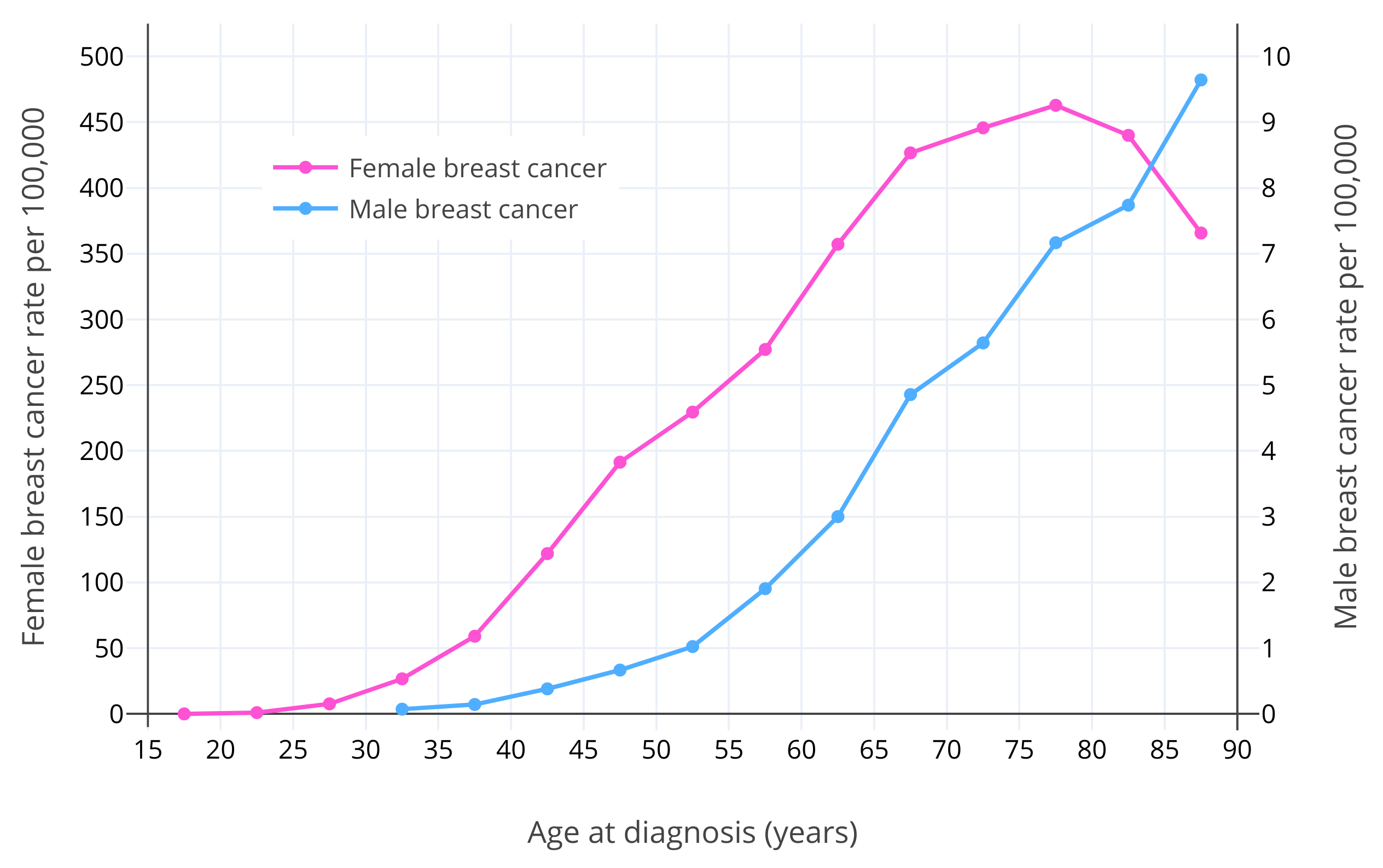 | Figure 1: Age-specific incidence rates per 100,000 for male and female invasive breast cancer in White Americans from the Surveillance, Epidemiology, and End Results (SEER) program of the National Cancer Institute (NCI) (2003–2012) (Ottini & Capalbo, 2017). Note that the male breast cancer and female breast cancer lines use different y-axes and corresponding scales (50× larger y-axis interval in the case of female breast cancer). |