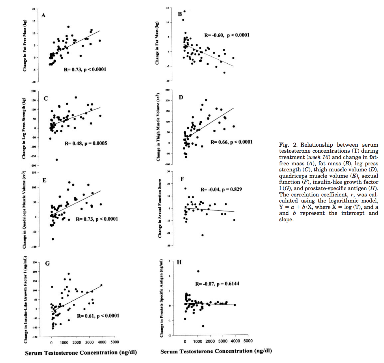 […] 61 eugonadal men, 18–35 yr, were randomized to one of five groups to receive monthly injections of a long-acting gonadotropin-releasing hormone (GnRH) agonist, to suppress endogenous testosterone secretion, and weekly injections of 25, 50, 125, 300, or 600 mg of testosterone enanthate for 20 wk. Energy and protein intakes were standardized. The administration of the GnRH agonist plus graded doses of testosterone resulted in mean nadir testosterone concentrations of 253, 306, 542, 1,345, and 2,370 ng/dl at the 25-, 50-, 125-, 300-, and 600-mg doses, respectively. Fat-free mass increased dose dependently in men receiving 125, 300, or 600 mg of testosterone weekly (change 13.4, 5.2, and 7.9 kg, respectively). The changes in fat-free mass were highly dependent on testosterone dose (P = 0.0001) and correlated with log testosterone concentrations (r = 0.73, P = 0.0001). Changes in leg press strength, leg power, thigh and quadriceps muscle volumes, hemoglobin, and IGF-I were positively correlated with testosterone concentrations, whereas changes in fat mass and plasma high-density lipoprotein (HDL) cholesterol were negatively correlated.
