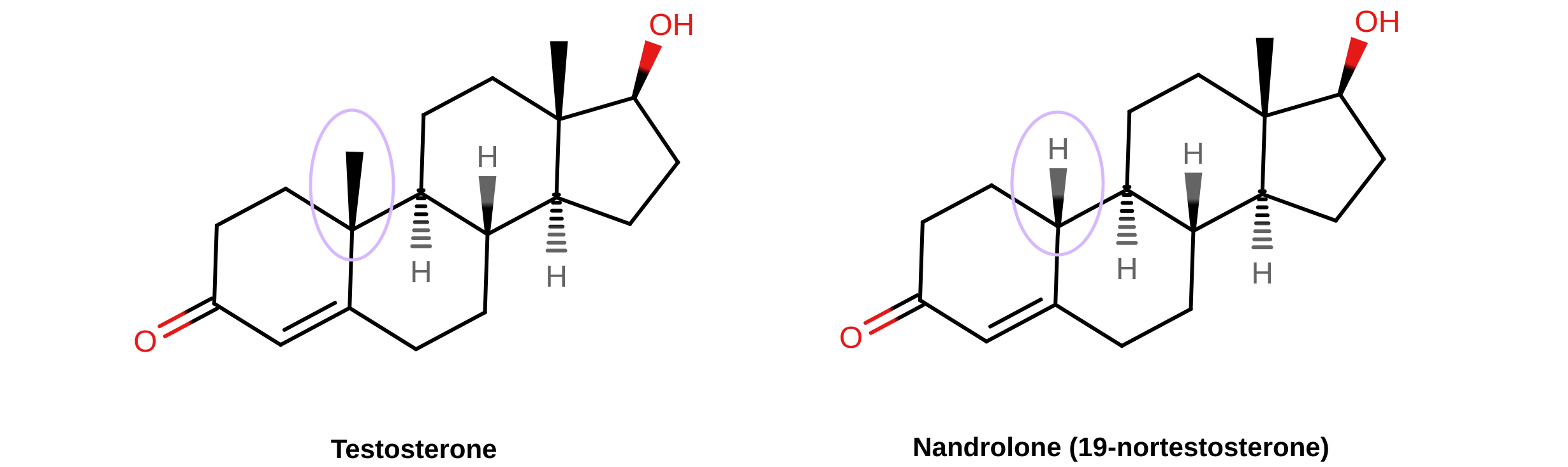 | Figure: Chemical structures of testosterone and nandrolone (19-nortestosterone). The structural difference between testosterone and nandrolone is at the C19 position and is highlighted by the circled areas. |