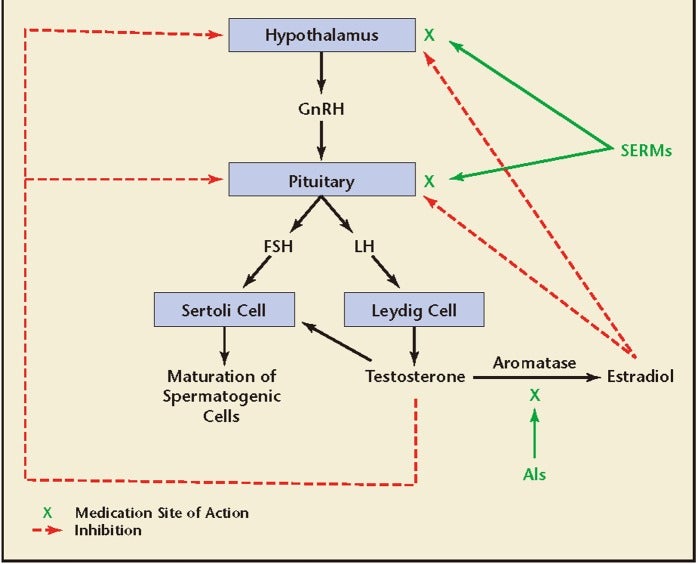 To circumvent the inhibition of LH and FSH from the pituitary by exogenous testosterone, a common strategy used by male reproductive and sexual medicine specialists, in which the goal is to increase testosterone levels while maintaining spermatogenesis, is to use SERMs and/or AIs instead of exogenous testosterone.