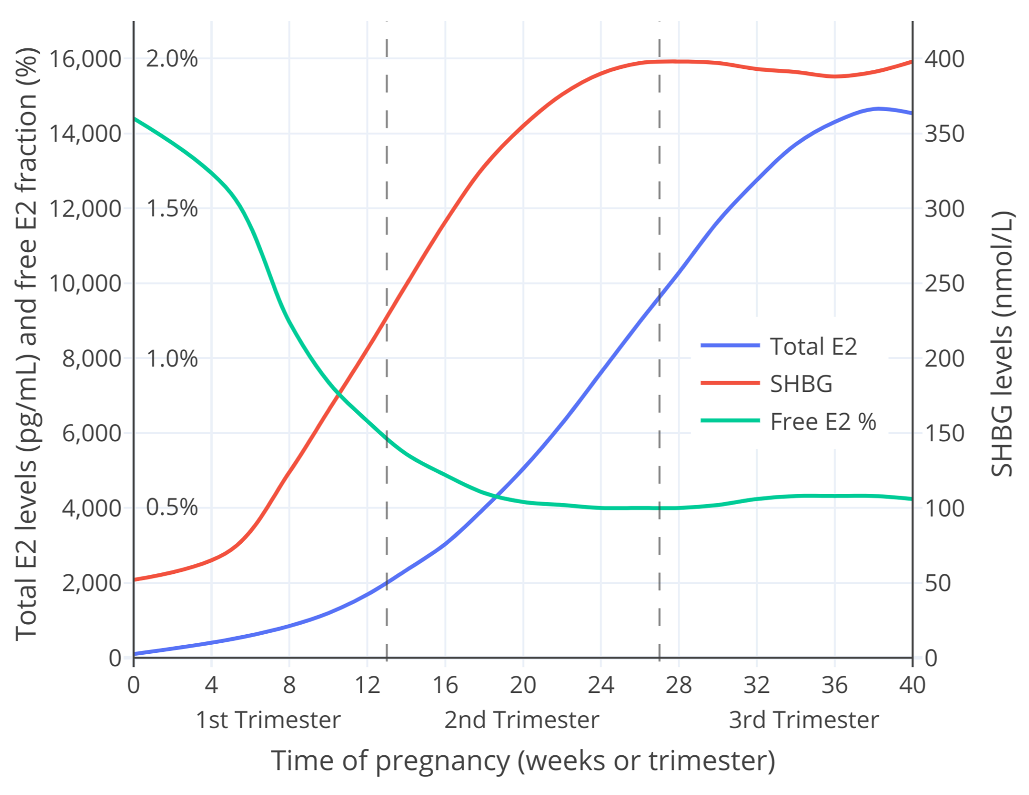 To summarize, there are profound increases in total estradiol levels and proportionally lower but still substantial increases in SHBG levels during pregnancy. In accordance with the marked increase in SHBG levels, the free estradiol fraction progressively decreases over the course of pregnancy. Studies are conflicting on the exact degrees to which free estradiol percentages decrease. In any case, the possibilities for the free estradiol fraction by late pregnancy range from about 0.5 to 1.5%. These figures can be compared to non-pregnancy free estradiol percentages of 1.5 to 2.1%. This may correspond to a maximal decrease in the free estradiol fraction in late pregnancy to around 60% of non-pregnancy. At the greatest extreme, the decrease may be to around 25% of non-pregnancy. Conversely, in earlier pregnancy, when estradiol levels are lower, free estradiol percentages are higher.